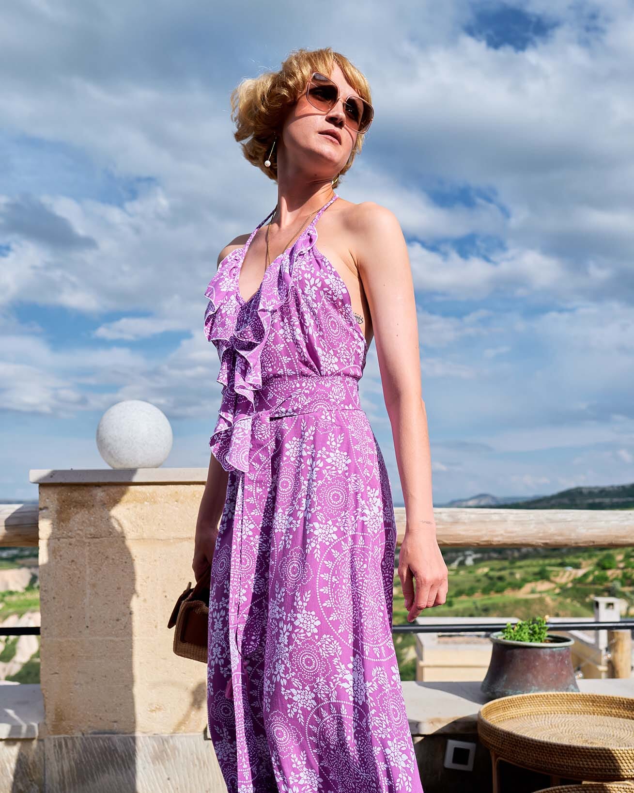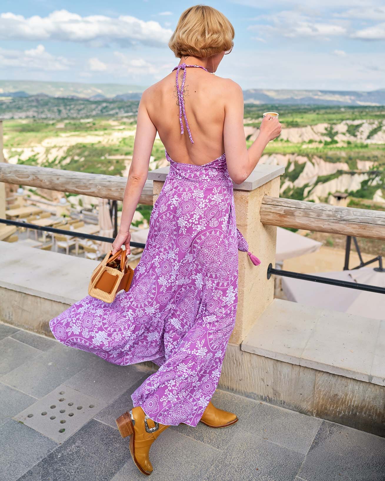 The Chikalu Dress in New World print is a statement of transformation. Its deep purple mandala design symbolizes strength and renewal. The backless halter features pleated ties for a balance of structure and movement, while the tasseled belt cinches the waist for a defined yet effortless fit. The tiered maxi skirt with a ruffled hem adds flow and presence, making this dress as powerful as it is elegant.
