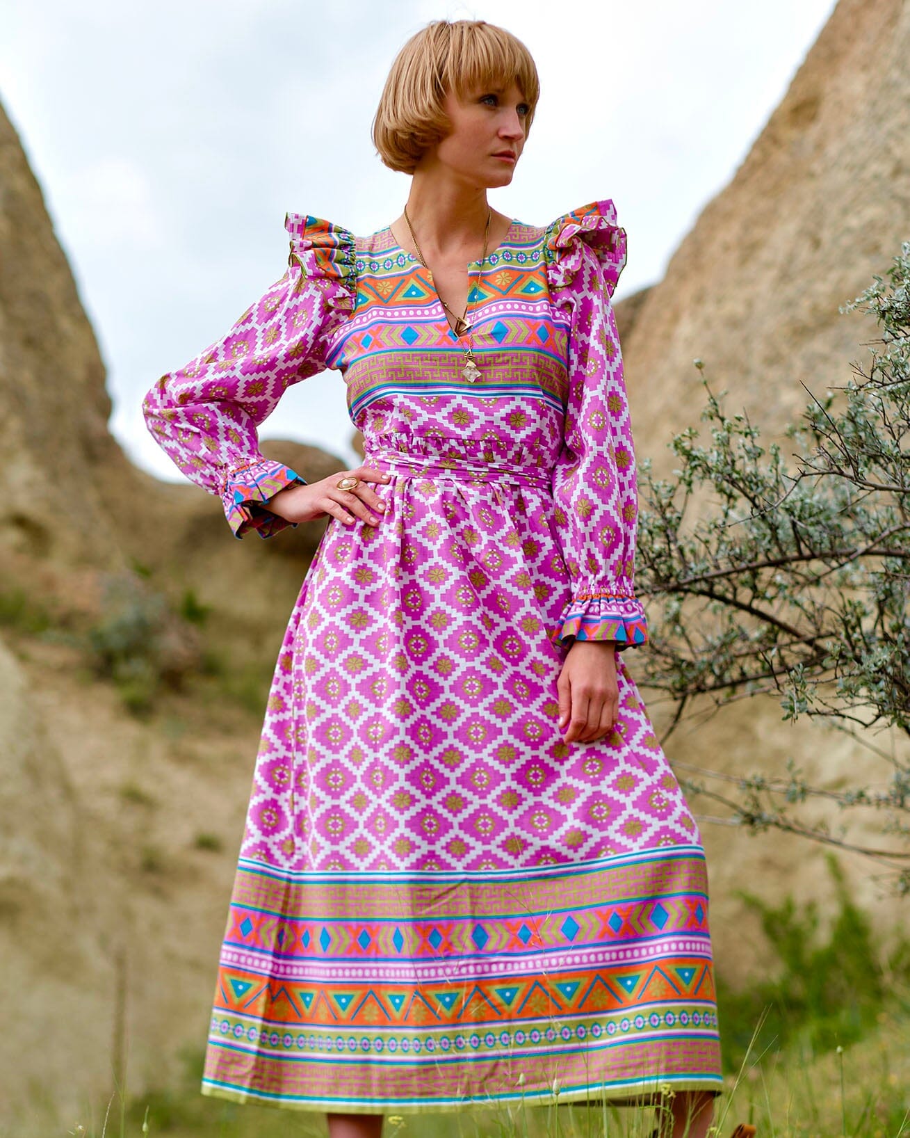 Crafted in the symbolic Evolution print, influenced by the sacred patterns of the Amazonian peoples, Essouira is a fusion of heritage and forward movement. The ruffle-detailed shoulders add a touch of distinction while the elasticated back ensures a comfortable yet sculpting fit. Falling at a flattering midi length.