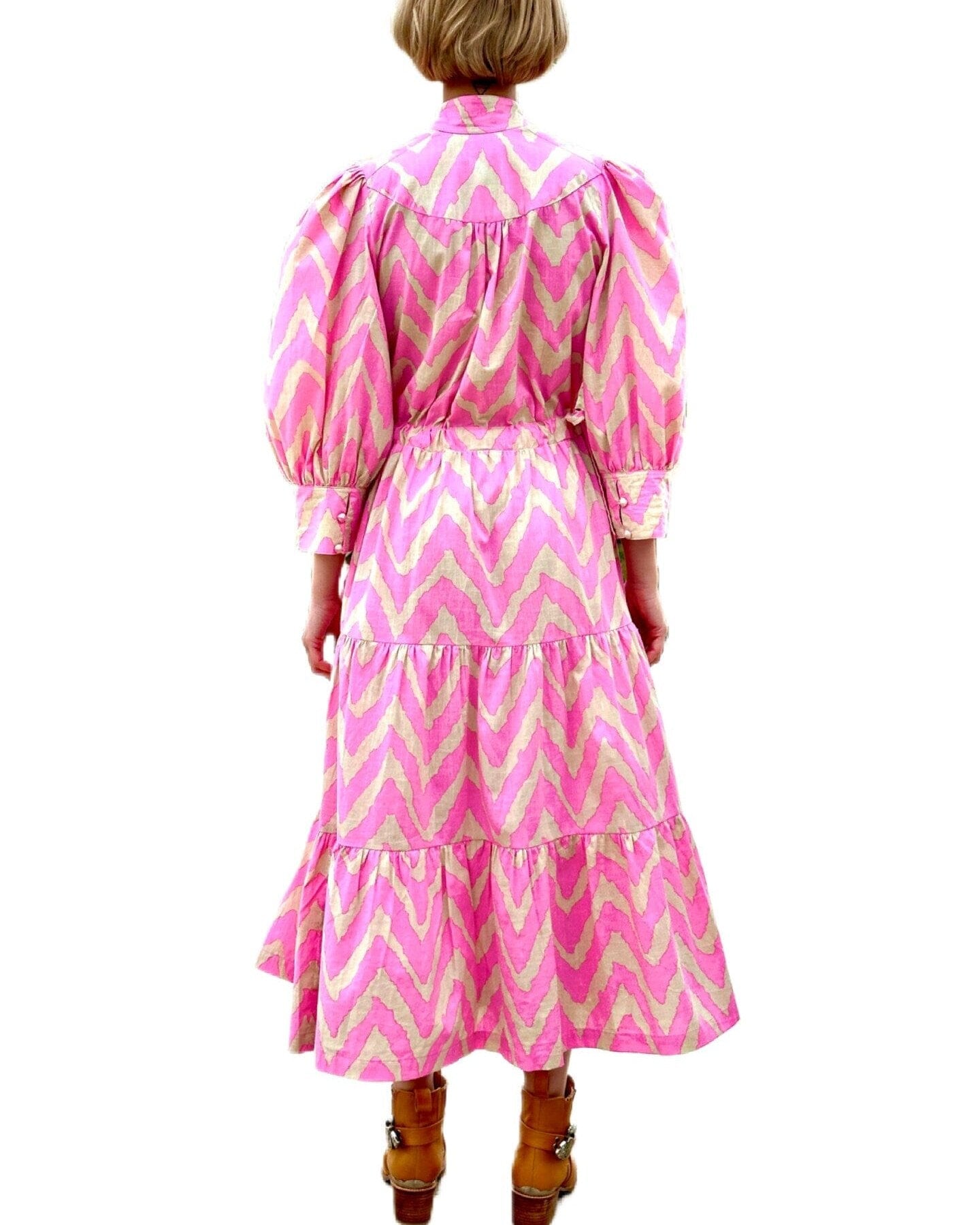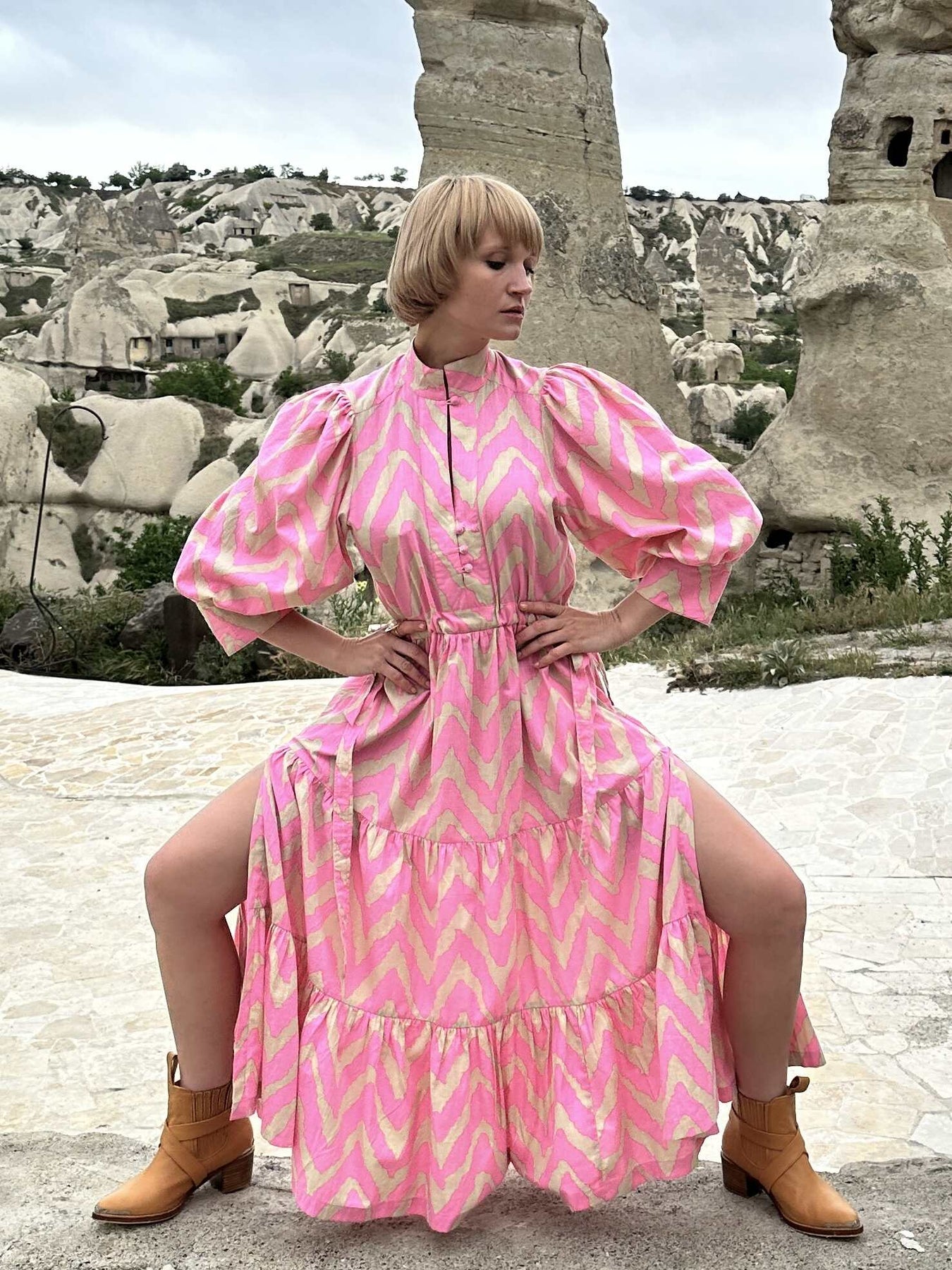 The Gabor Dress in Flow commands attention. Its dramatic sleeves and adjustable side ties create a bold yet versatile silhouette, flattering both smaller and curvier body shapes. Now crafted in Cotton Crossfire, it has a rich, structured feel that elevates its impact. Wear it cinched for definition or loose for effortless movement—either way, it delivers presence.