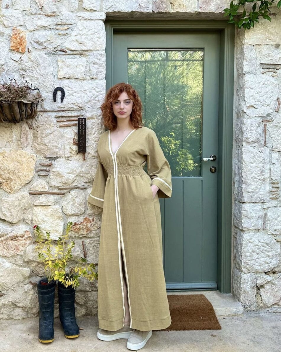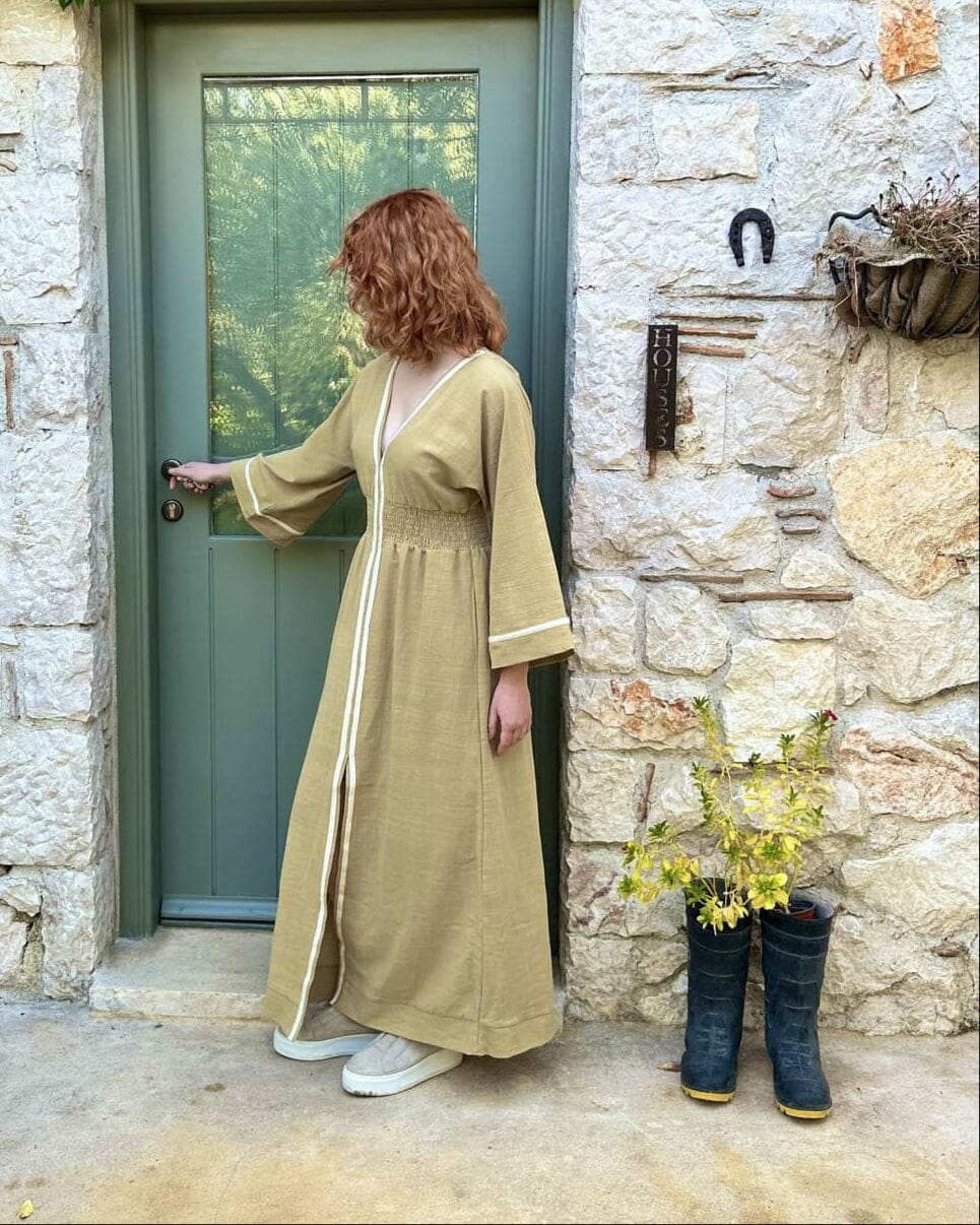The Hakuna Dress is crafted from a high-frequency, textured linen-cotton blend, chosen for its purity and connection to the natural world. This fabric breathes like the earth itself, soft yet resilient, making it a grounded choice for mindful living.