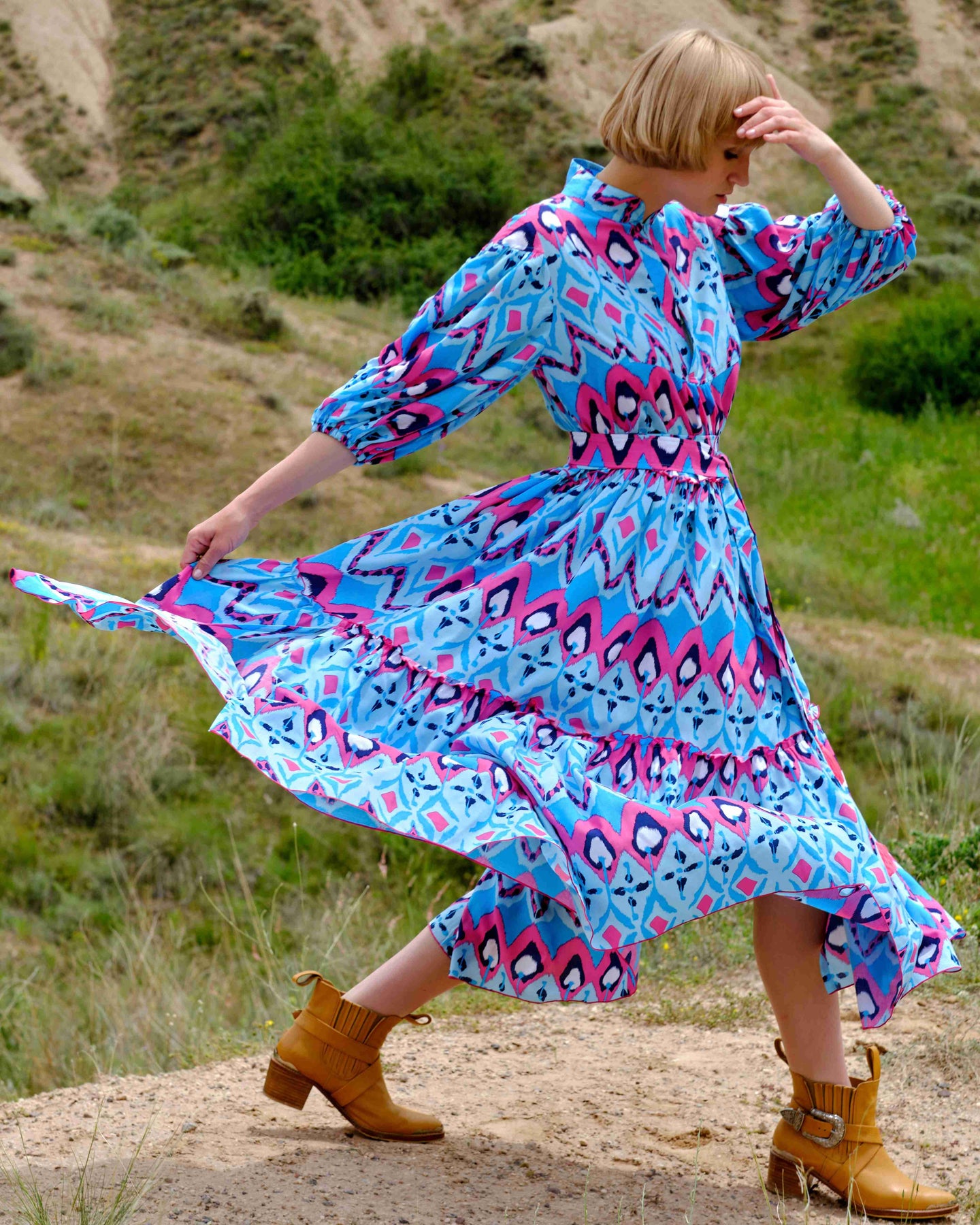 The Kambo Dress – Inner Dance Print - Bold, effortless, and full of movement, the Kambo Dress in Inner Dance print is all about versatility. Tribal Ikat patterns in electric blues and vibrant pinks bring energy to every step. 🍃