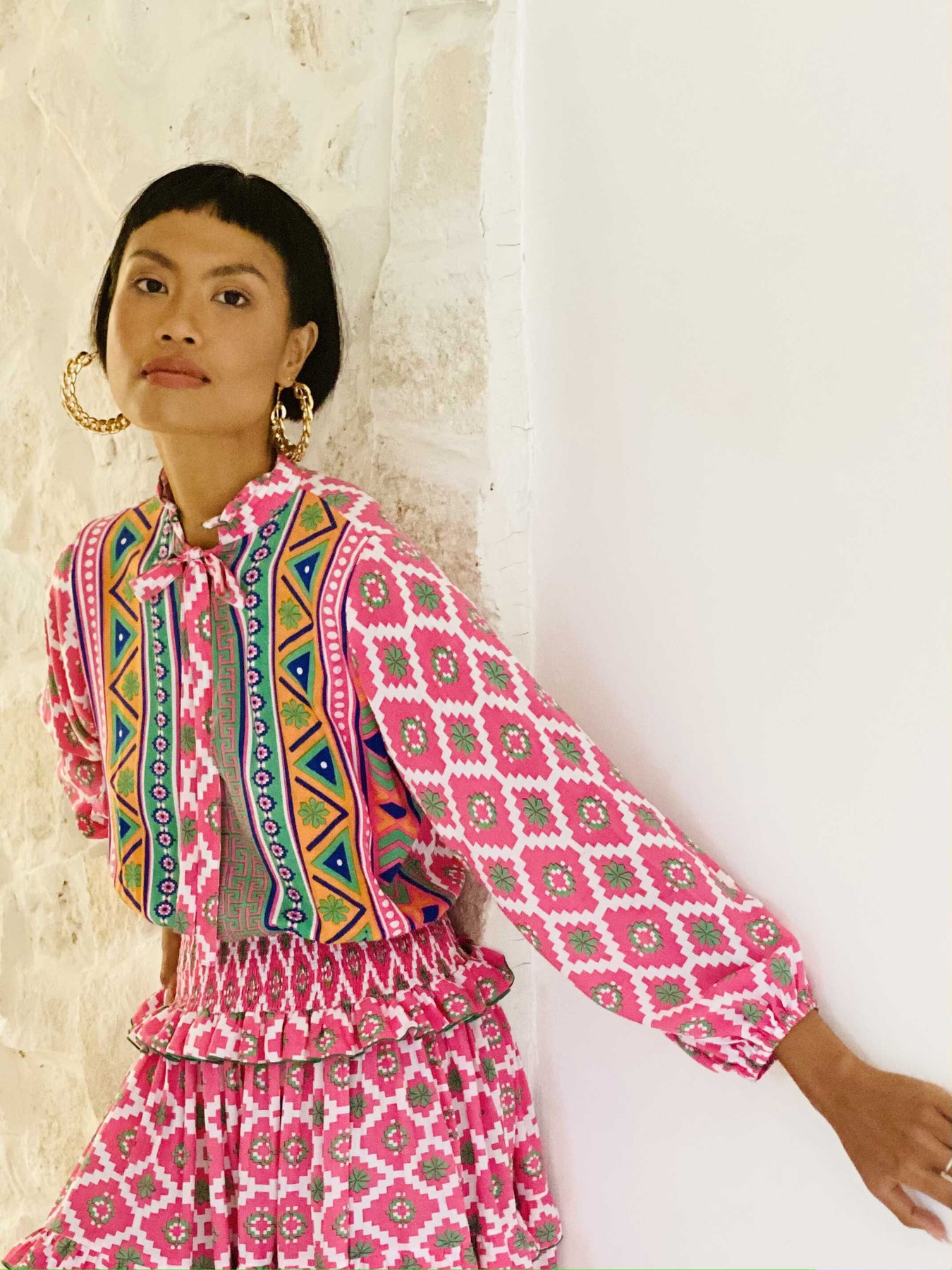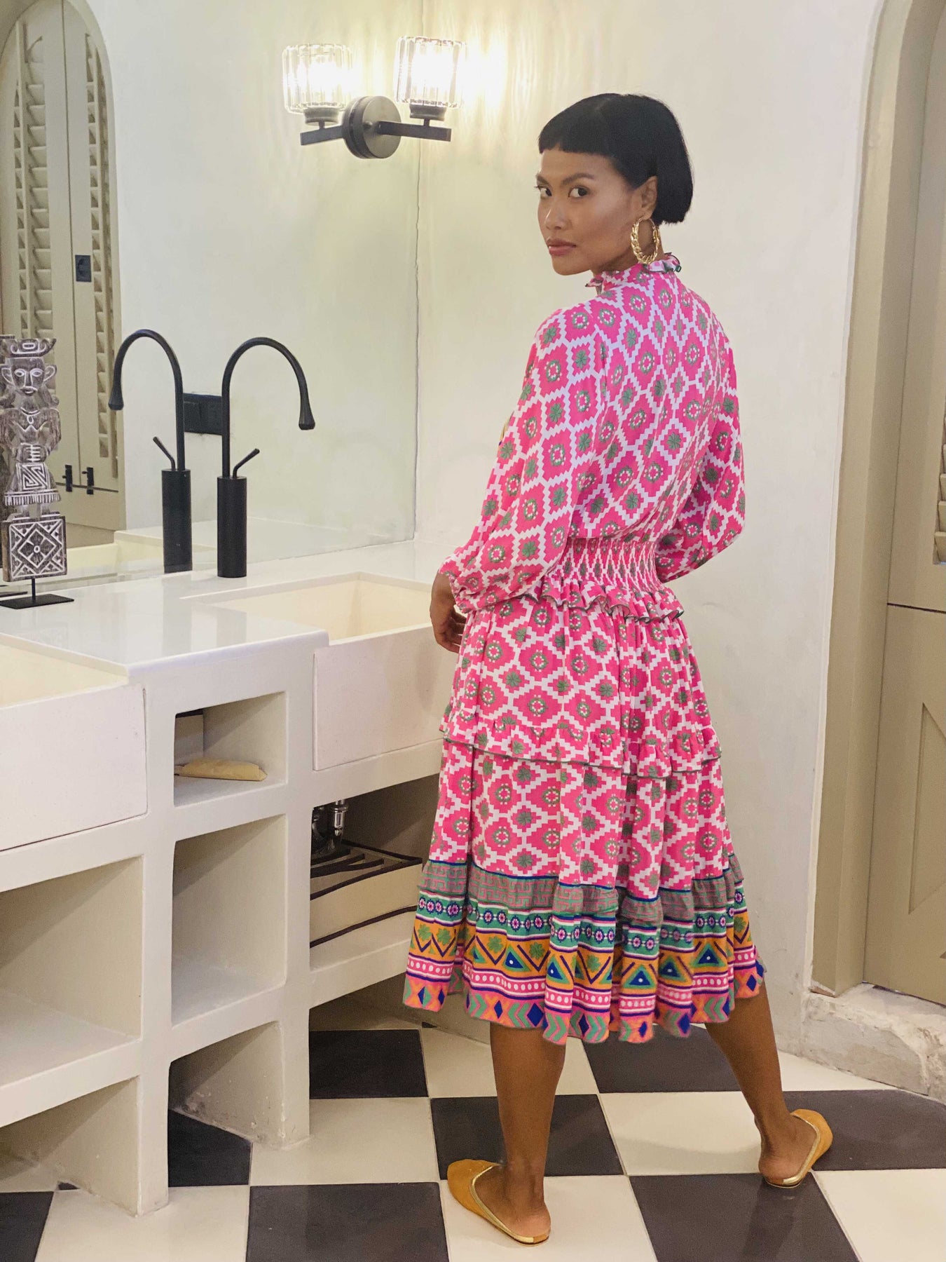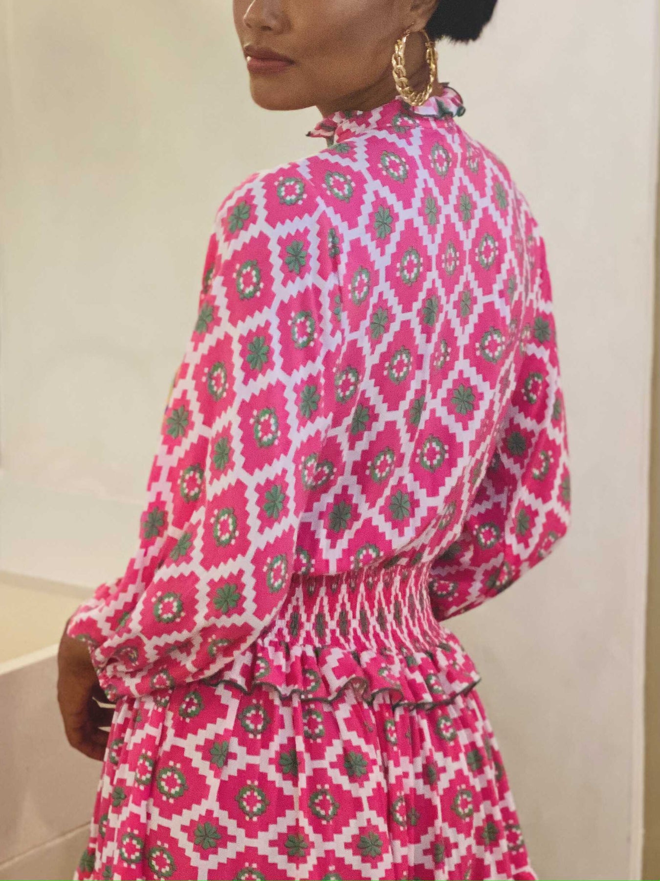 Romantic and feminine dresses are a mainstay of Feather's collections. This ruffled -Geometric print is called Awakened Dreamer and i a headliner print for 2023. The style is made from lightweight printed voile and starts its journey with a ruffled mandarin style neck with a deep V in the neckline that can be tied in a bow, The waist is cinched with a comfortable adjustable elastic and flows in ruffles to mid length. Sleeves have a slight bell and comfortable elastic.