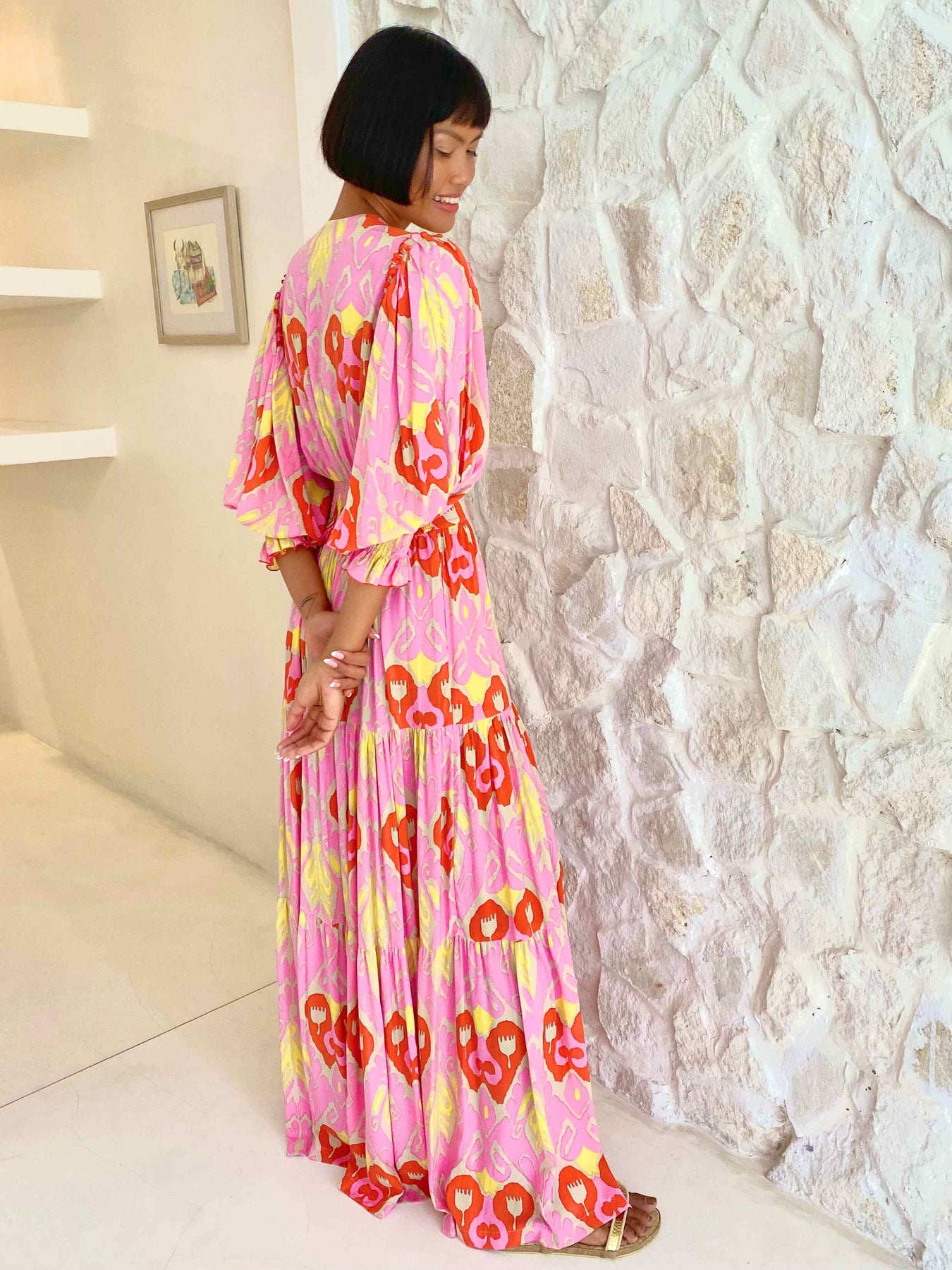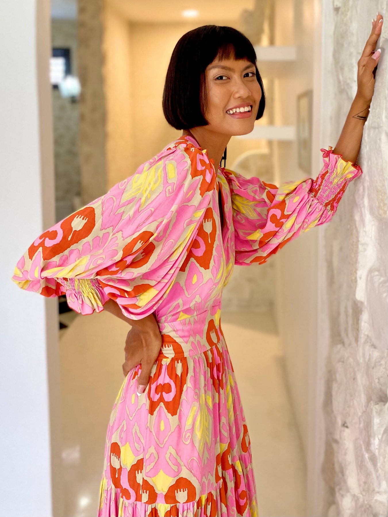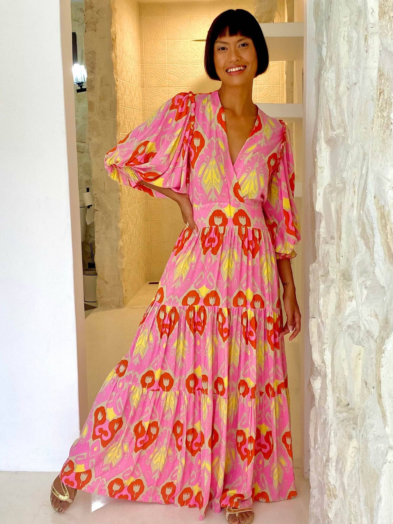 Orelia is inspired by a vintage design from a glamorous era. Cut in a flattering wrap effect silhouette and has flouncy ruffle trims in the sleeves and tiered skirt. Beautiful V Neck with a comfortable wrap back... perfect for all body shapes. Wear yours to a party or more relaxed with flats. Fit is true to size and model wears a size Small.