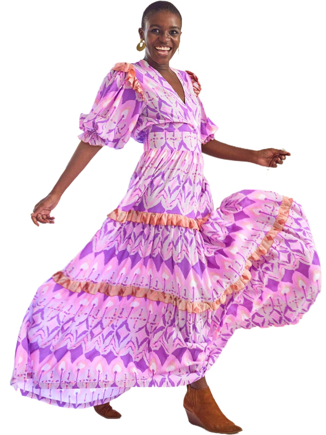 Introducing Orelia, a timeless beauty inspired by vintage glamour. ✨ This stunning maxi dress features a flattering wrap-effect silhouette, accentuated by flouncy ruffle trims on the sleeves and a tiered skirt. The beautiful V-neck and comfortable wrap back add an extra touch of elegance to this versatile piece, making it perfect for all body shapes. Whether you're heading to a party or opting for a more relaxed look with flats, Magical Creation High Frequency print. The fit is true to size, and our model wears a size Small.