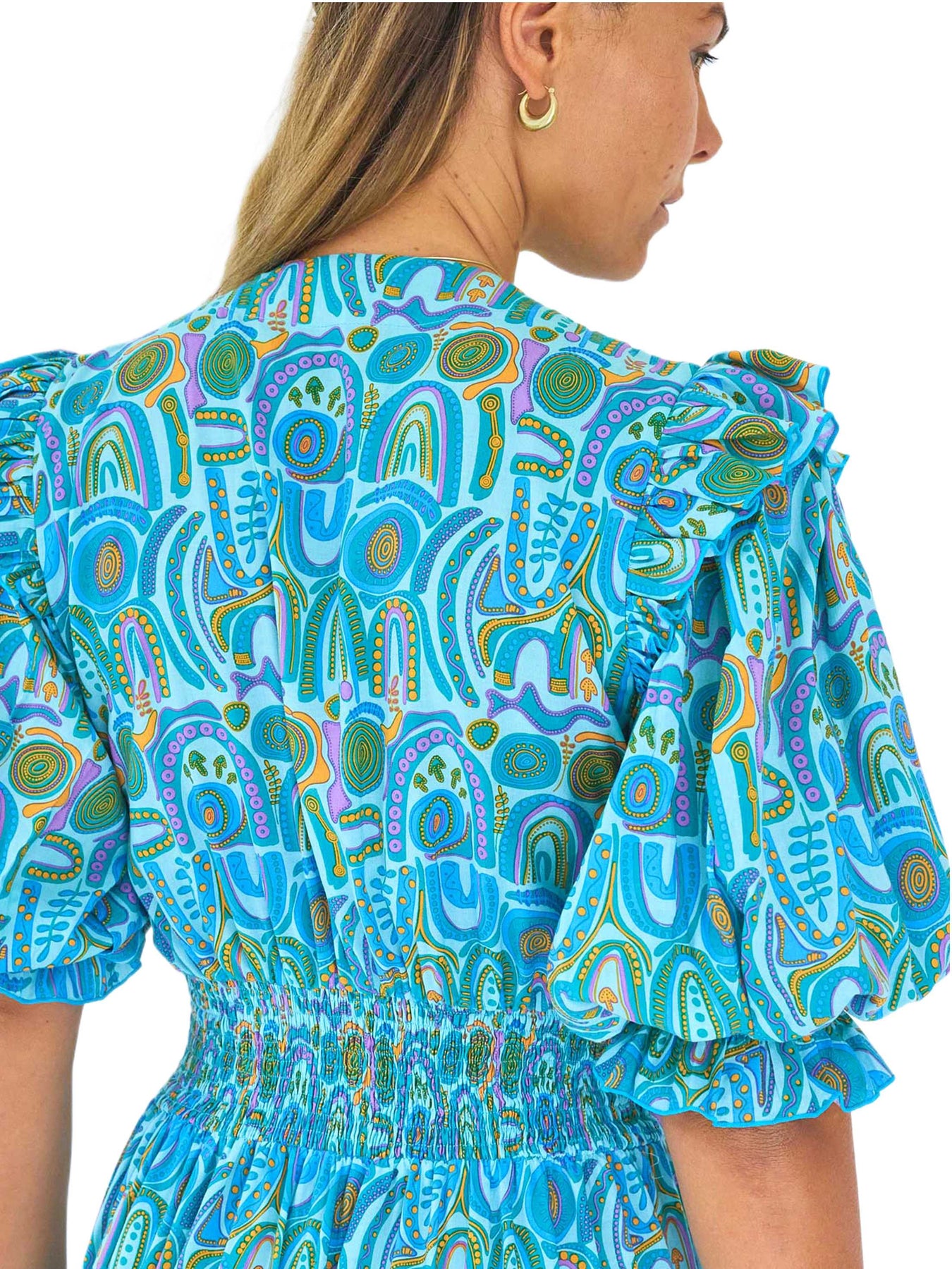The captivating print, a collaborative creation with Aboriginal Artist Sheri Skele, is named "Walkabout".