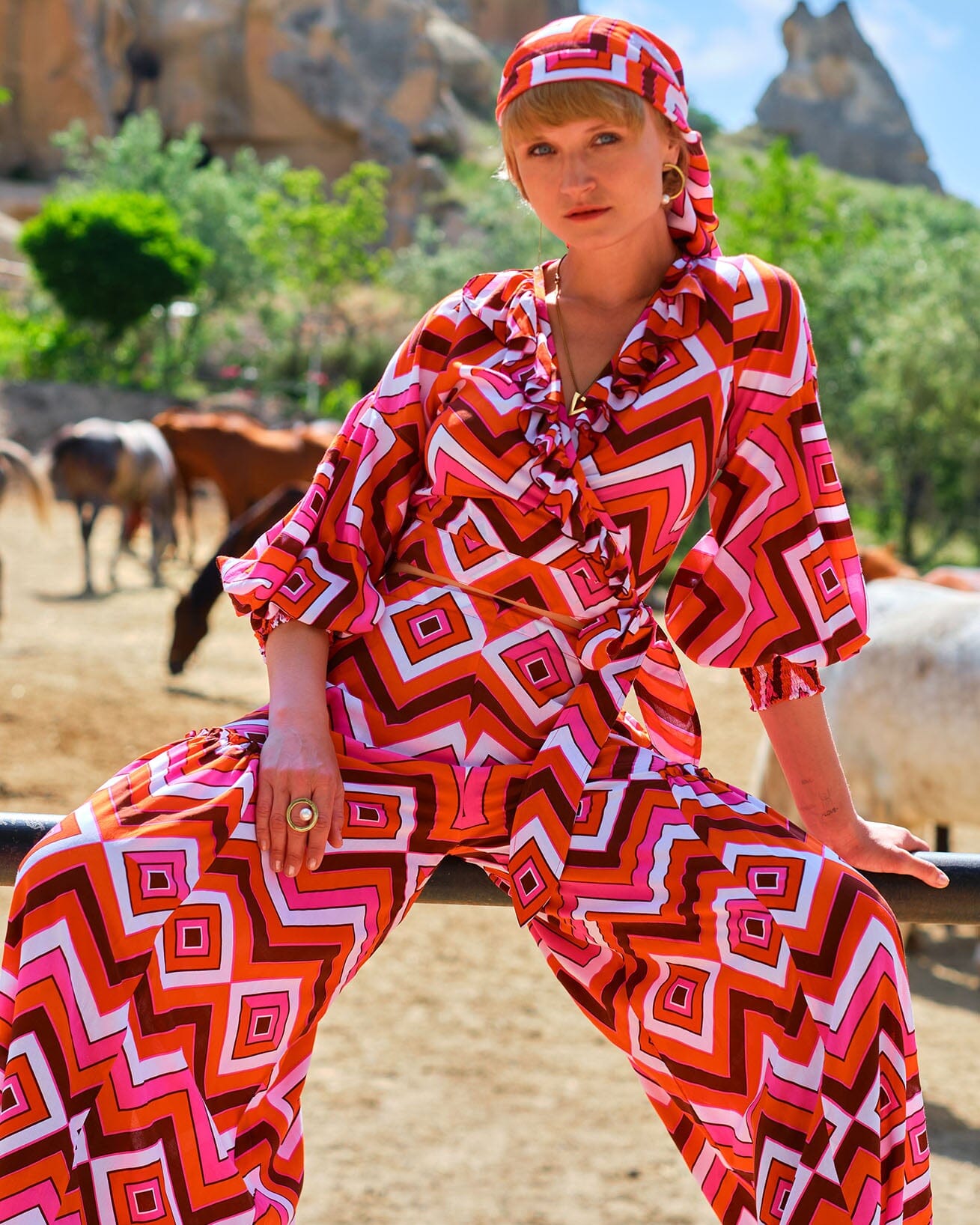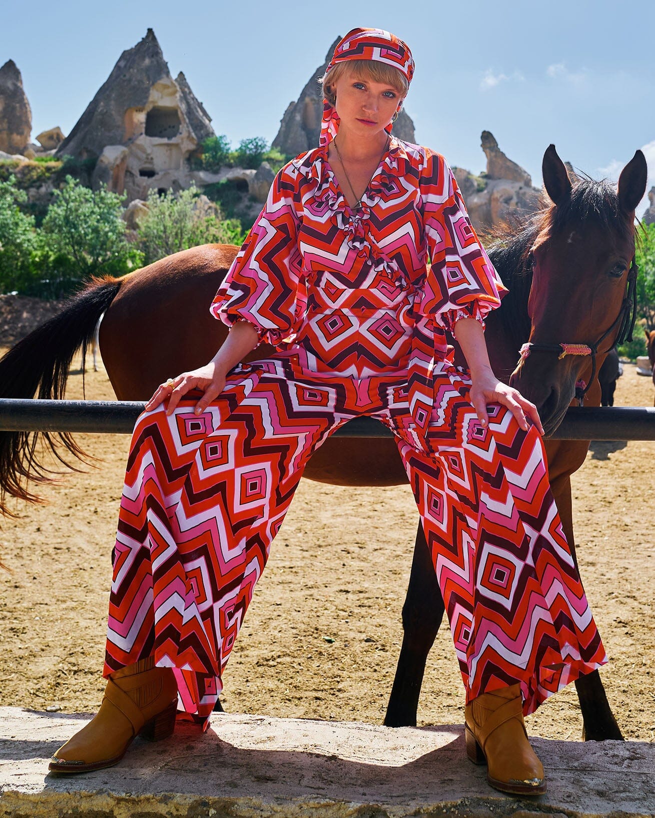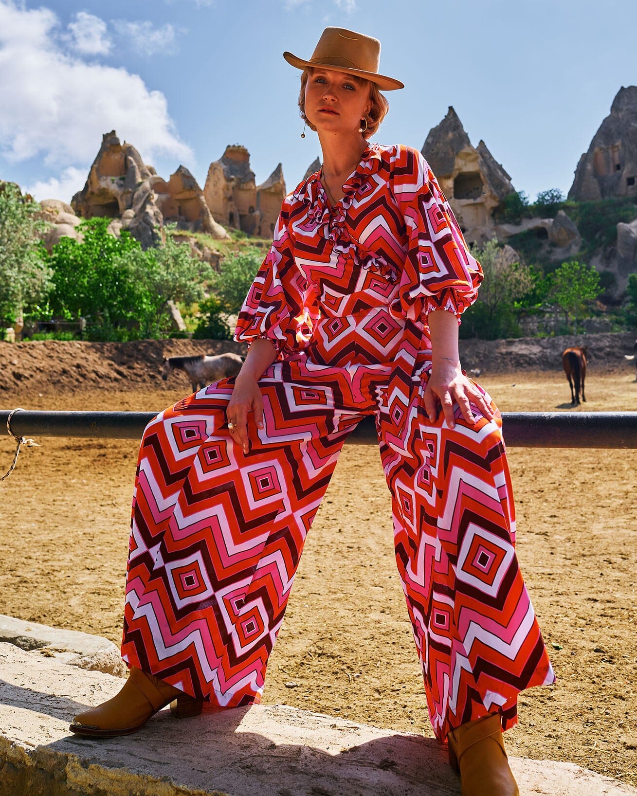The Rosa Ruffle Top in Magic Amazonia print brings bold energy in radiant red hues. Designed with a flattering crossover wrap, it features cascading ruffle details and dramatic balloon sleeves for added impact. Versatile in styling, it can be tied at the side or back for a custom fit.