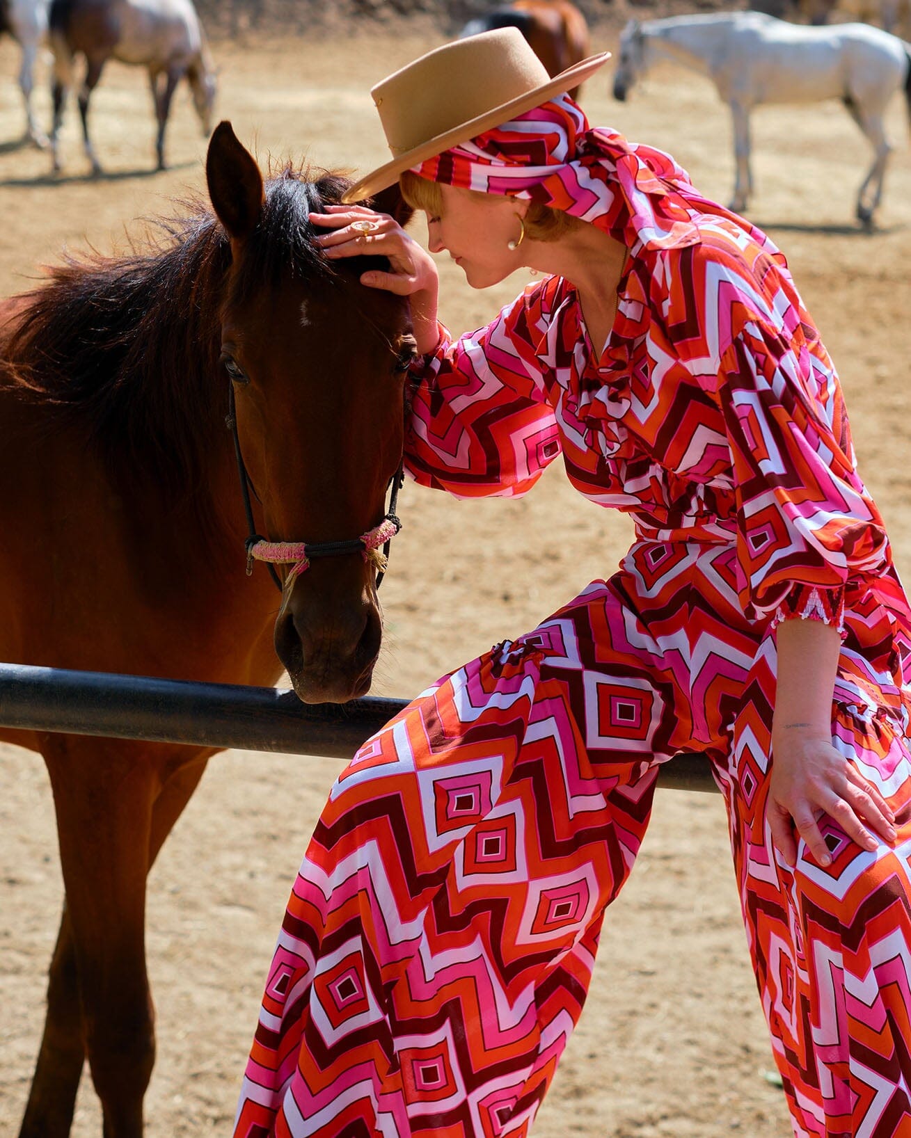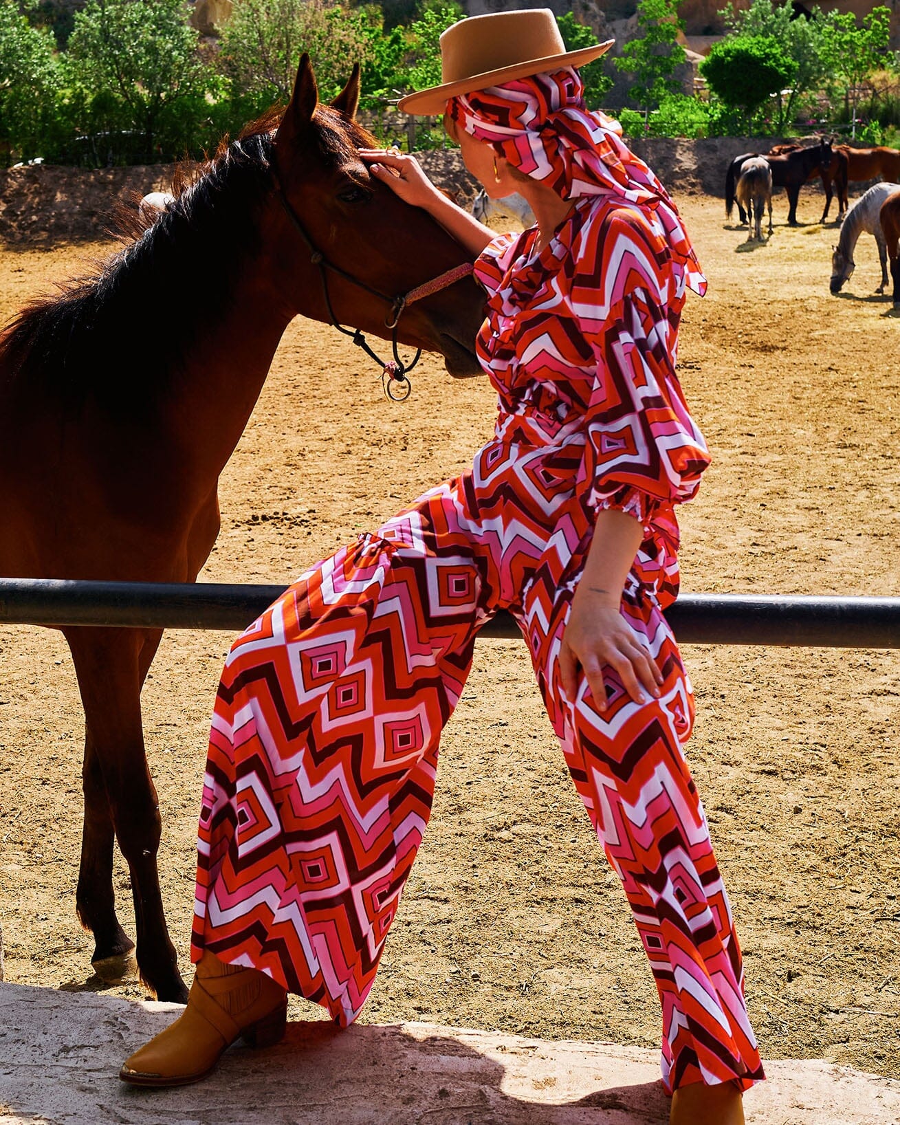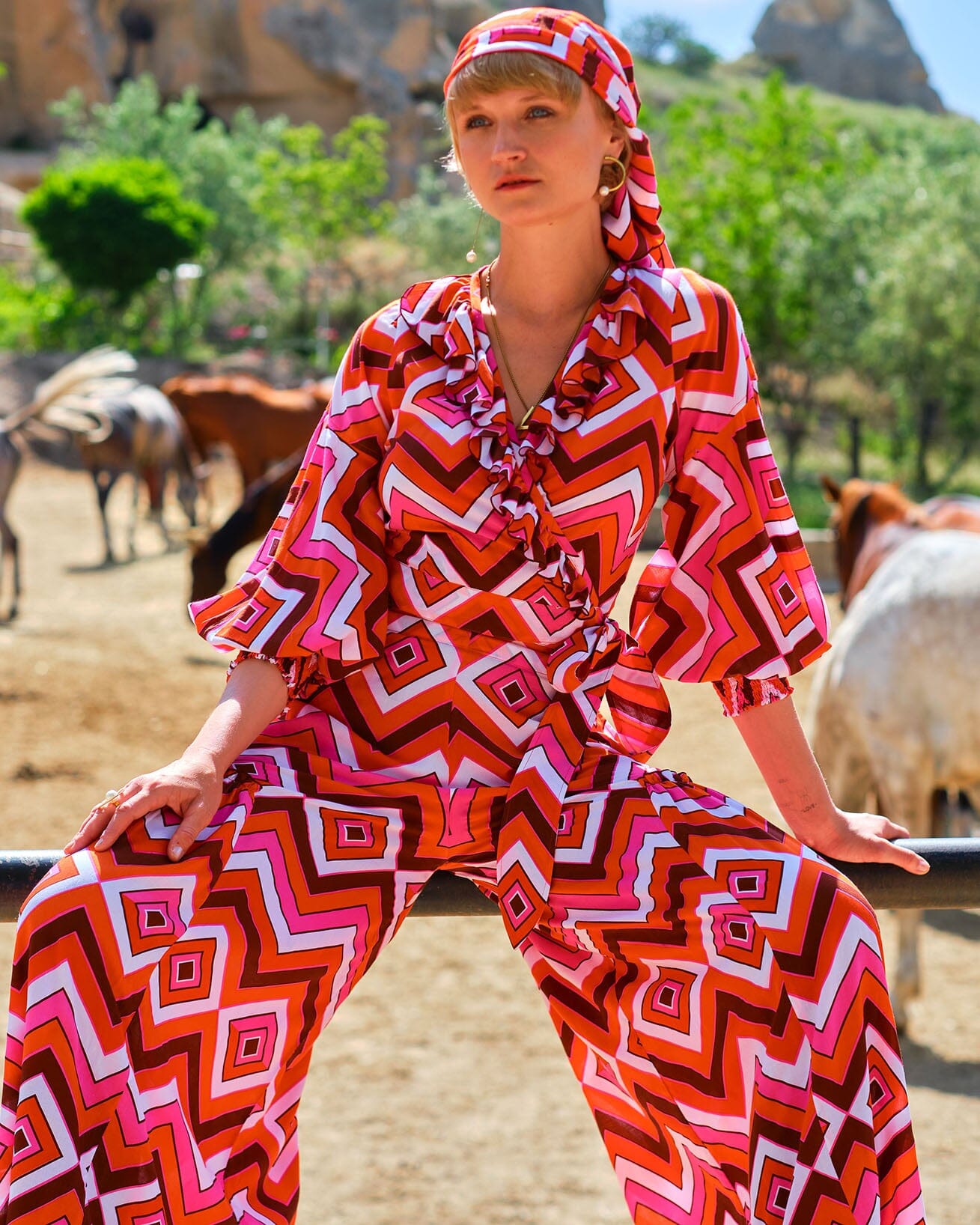 The Rosa Ruffle Top in Magic Amazonia print brings bold energy in radiant red hues. Designed with a flattering crossover wrap, it features cascading ruffle details and dramatic balloon sleeves for added impact. Versatile in styling, it can be tied at the side or back for a custom fit.