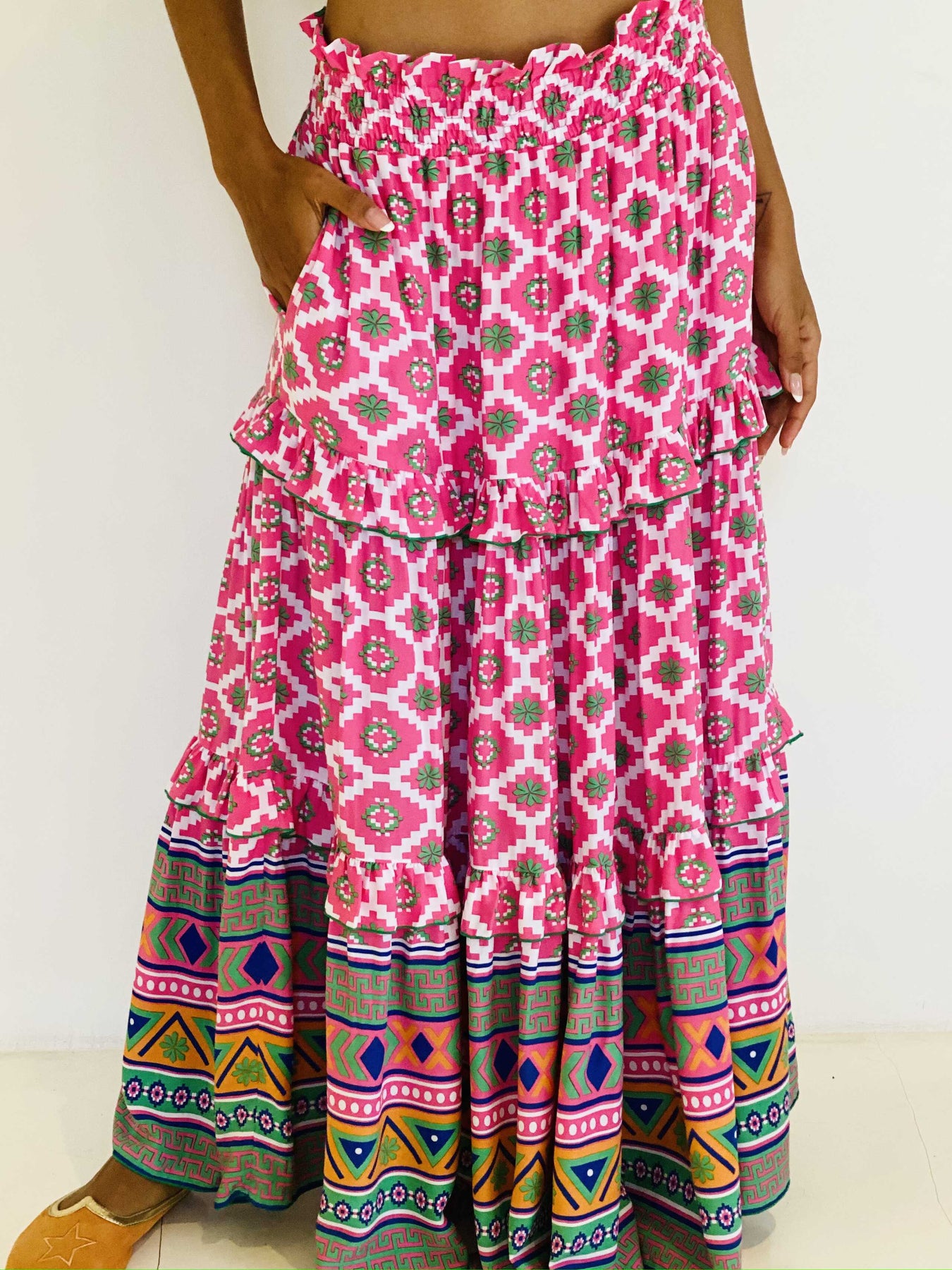 Tariffa Maxi skirt is crafted in beautiful voile with plenty of floral ruffles that move beautifully when in motion. It has a shirred comfortable waist and a looser fit for a flouncy silhouette Style yours with complimenting Kaiema Top.
