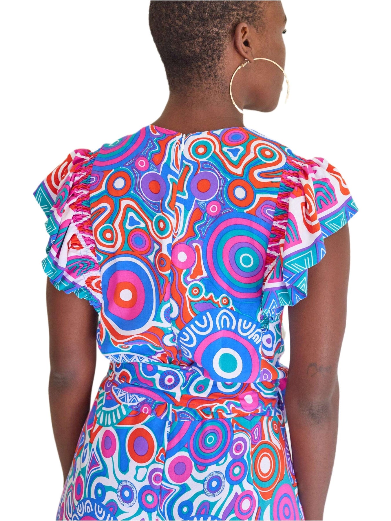 This jumpsuit boasts an elegance fit-and-flare design, accentuating the waist with a tie-around belt that offers styling flexibility – wear it to the front or side, as you please. The addition of cross body and ruffle cap sleeves adds an extra layer of charm, making it an enchanting choice for both day and night ensembles.