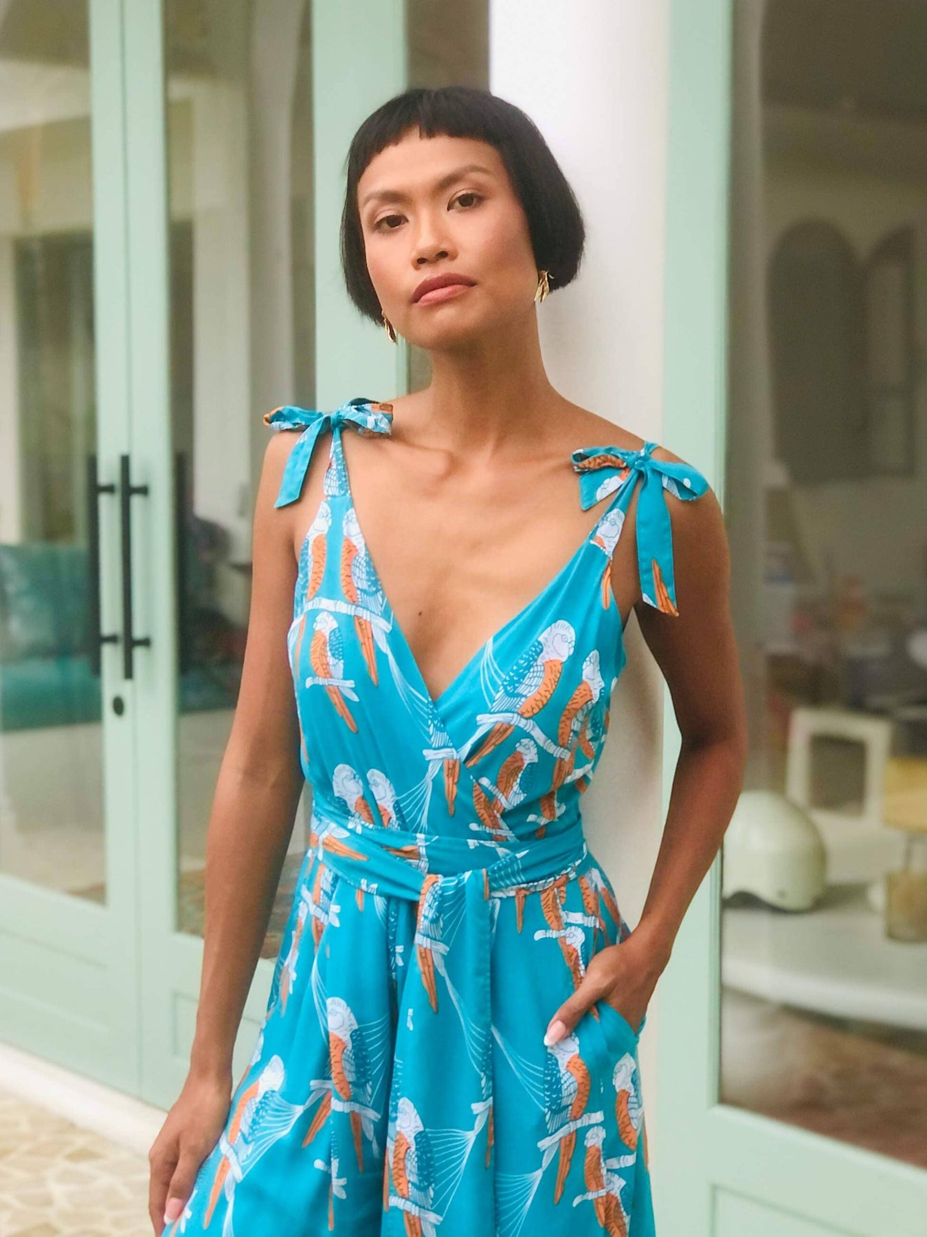 Cher Jumpsuit la divine lightweight cloth, it has a wrap effect pleated bodice and voluminous wide-leg shape with slits up the front that adds to the movement and drape of the piece and falls nicely to the ankle. Wear it on vacation, adjusting the shoulder straps to best suit your frame. Print is AMAZON LOVEBIRD. Model wears size S.