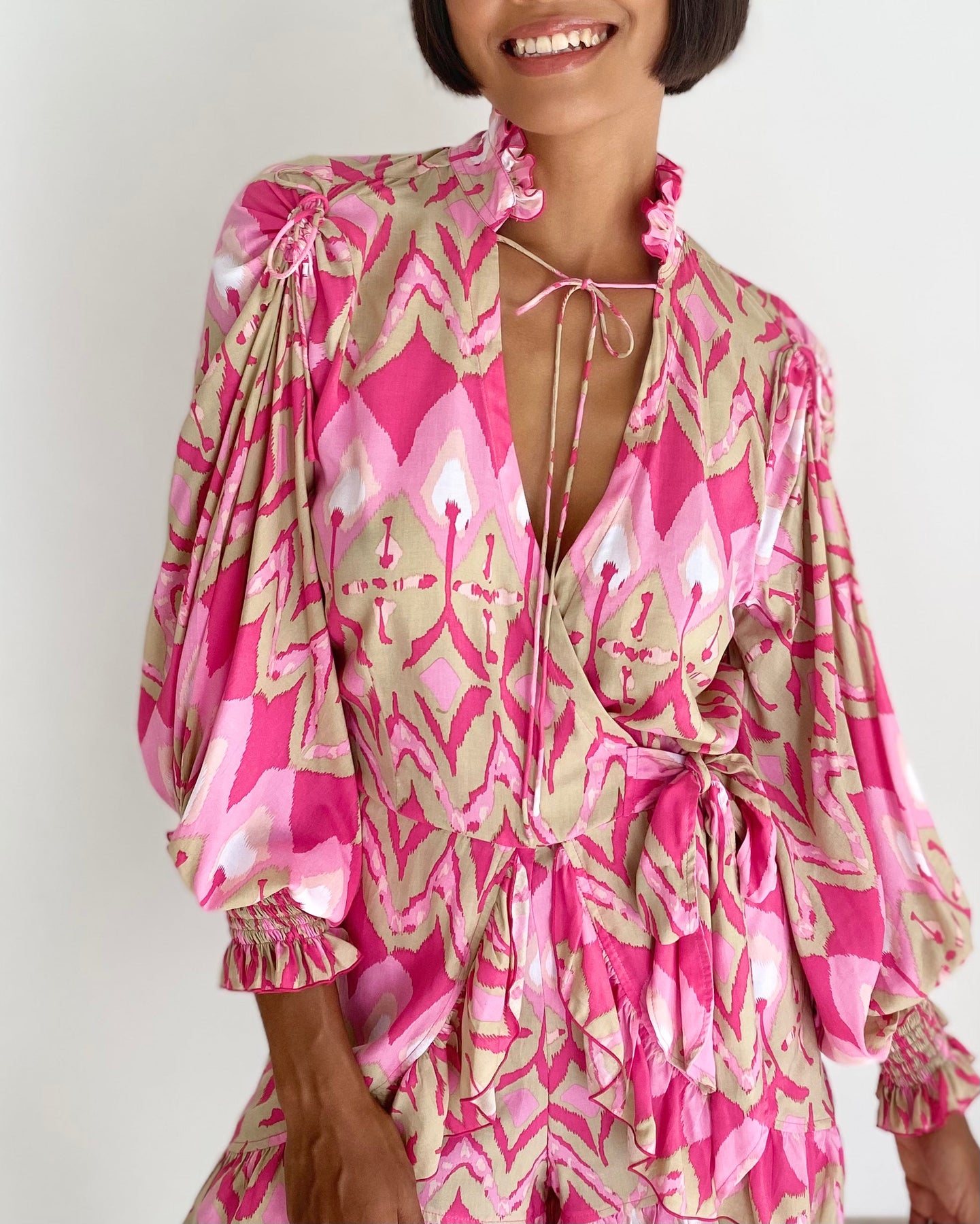 Feather & Find's incredible 'Kaiema' Playsuit' is cut from a divine pink ikat print called HEART ENERGY - the silhouette ties at the side help to accentuate the flouncy blouson sleeves and flared ruffle short pants. It is elasticated on the back with an open back cut out and fastened with 2 buttons at the nape of the neck. Drawstring ties are placed at the shoulder for adjustment.
