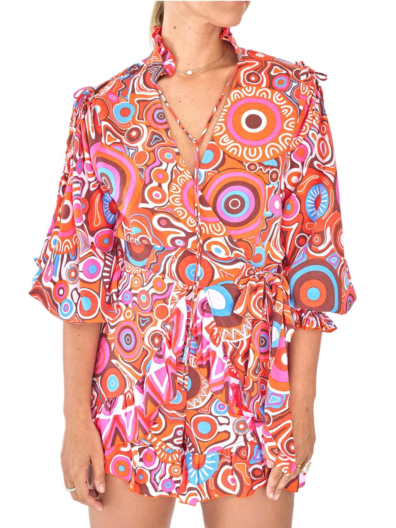Feather & Find's incredible 'Kaiema' Playsuit' is cut from The New Print Dreamtime and part of the New Collaboration Collection - the silhouette ties at the side help to accentuate the flouncy blouson sleeves and flared ruffle short pants. It is elasticated on the back with an open back cut out and fastened with 2 buttons at the nape of the neck. Drawstring ties are placed at the shoulder for adjustment.