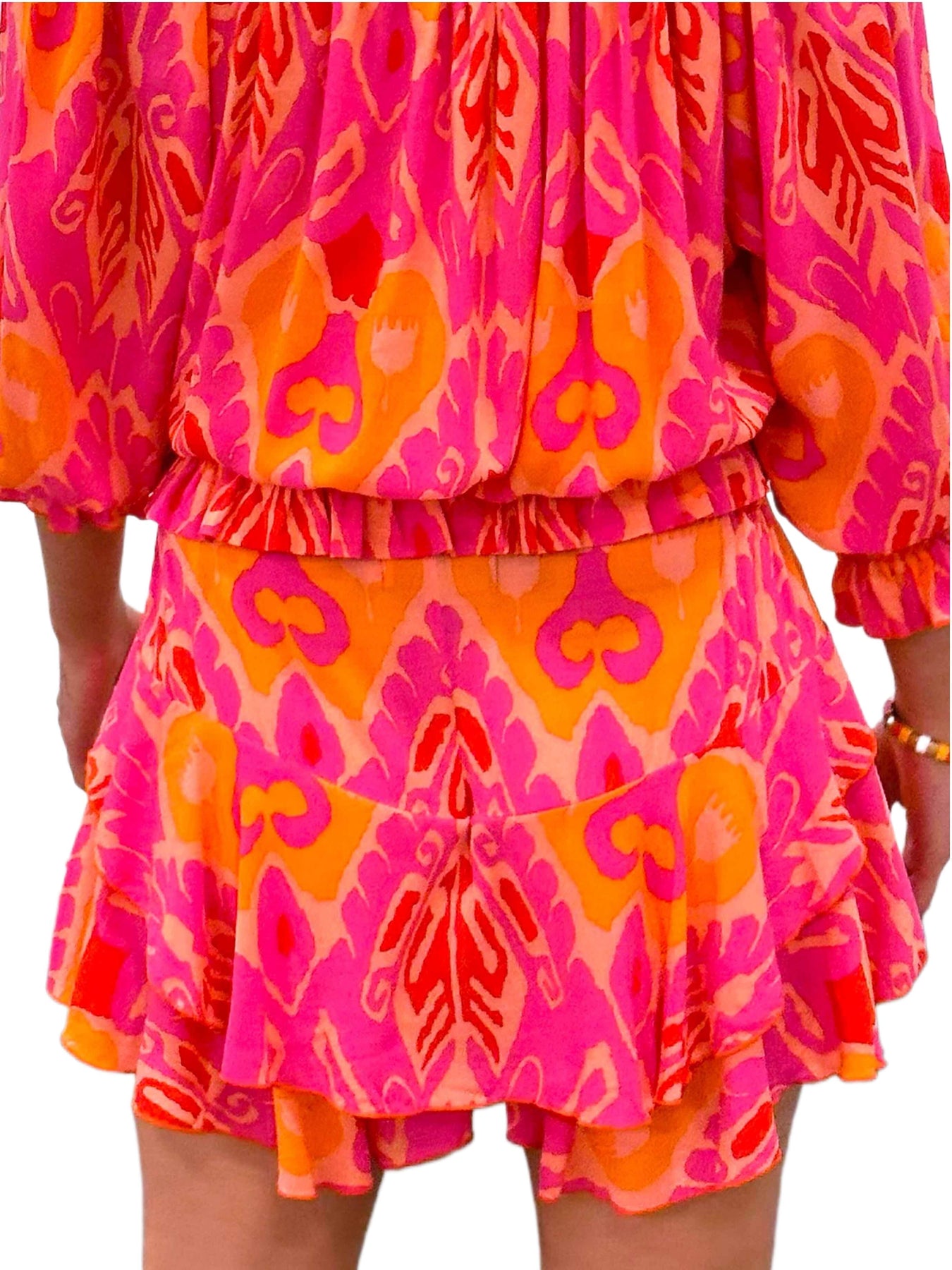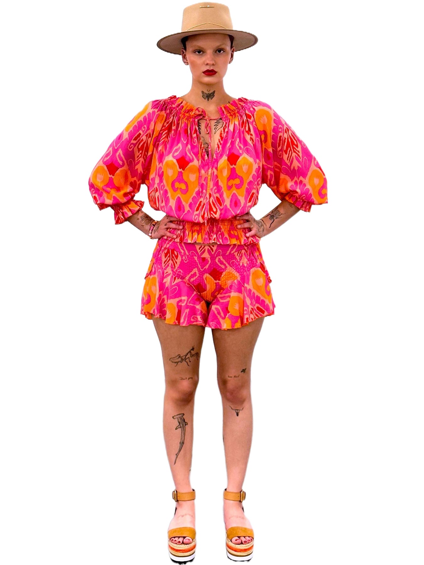 Shakti Shorts in print Joy Frequency have a loosely draped silhouette that creates the illusion of a mini skirt at first glance. Cut from lightweight printed voile, they sits low on the waist and are gathered to enhance the fluid shape. Style yours with a cropped top and sandals.