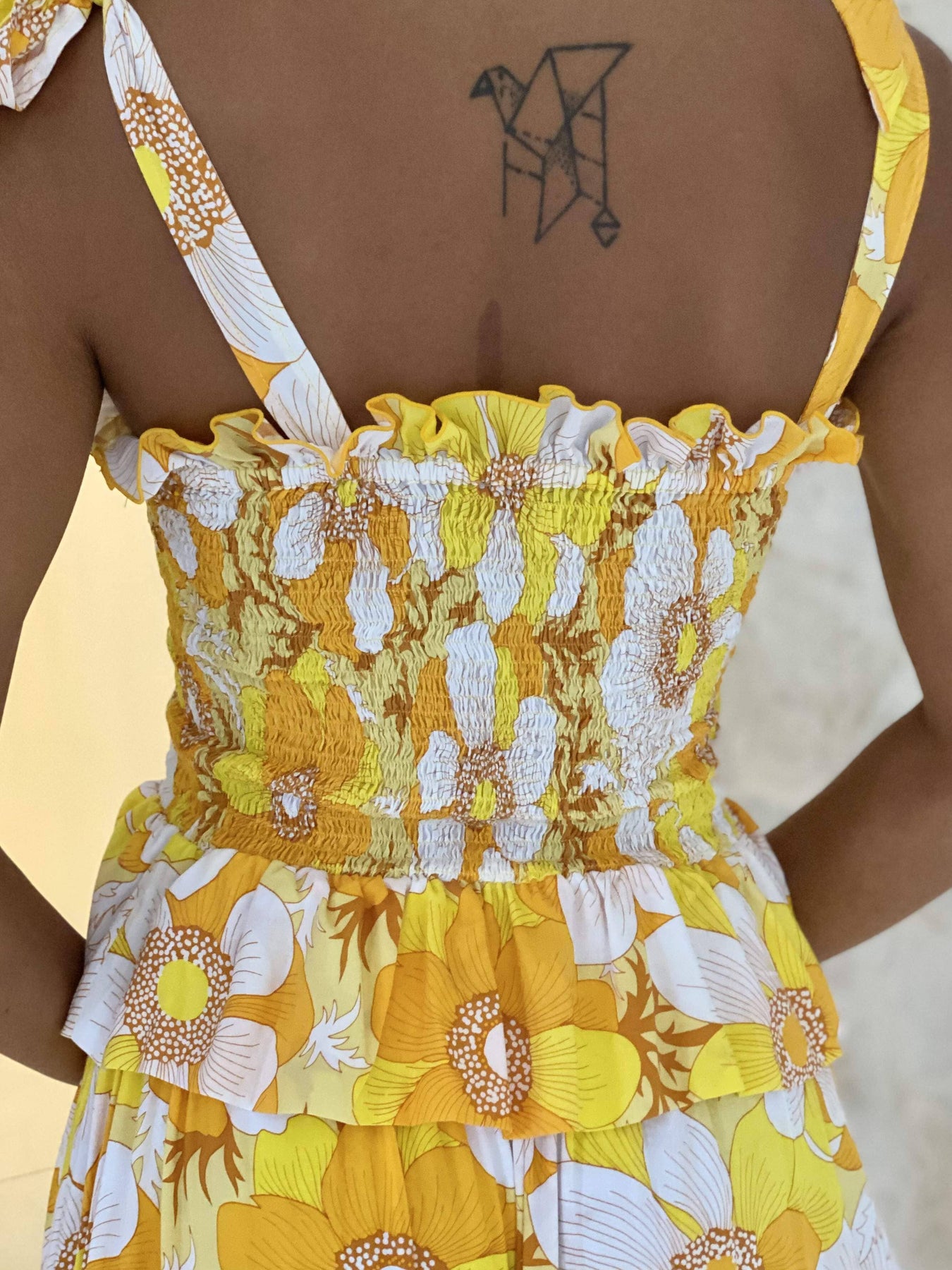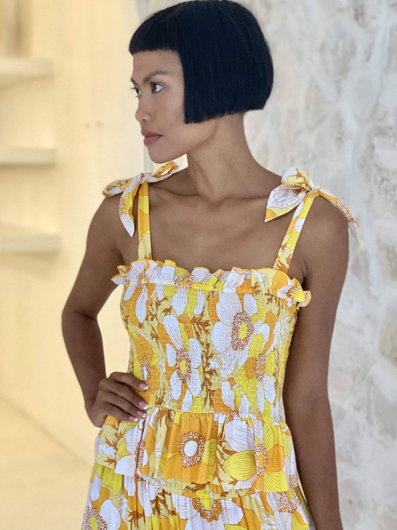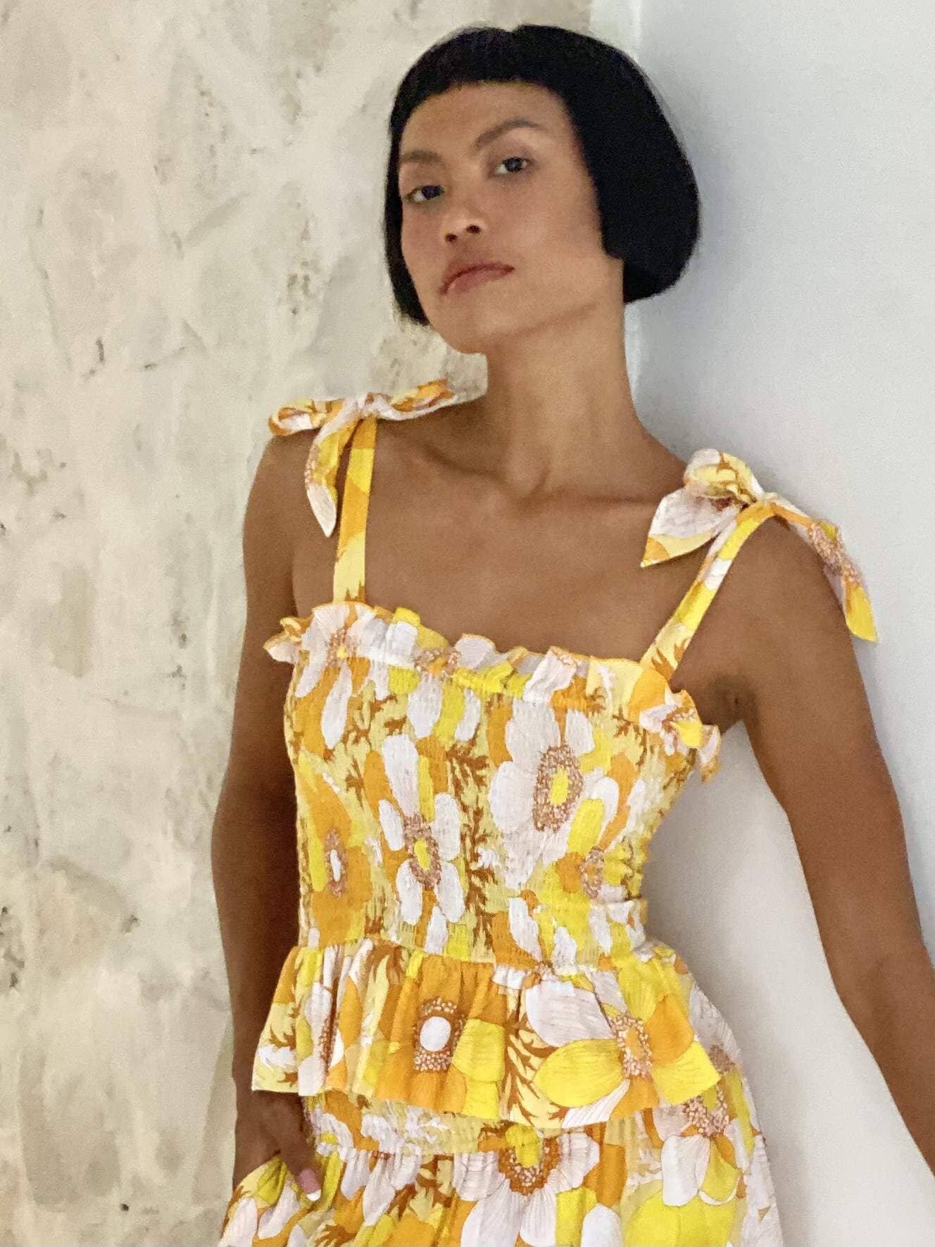 Shiva Top is a new edition to our fantastic 2023 Collection Queen of the Light. Shiva is a sleeveless bow tied at the shoulder top with flattering and flexible roushed bodice. Shine the light print is an extremely pretty signature print that is matched perfectly with this style. Pair it with TARIFFA skirt. Model wears a size S.