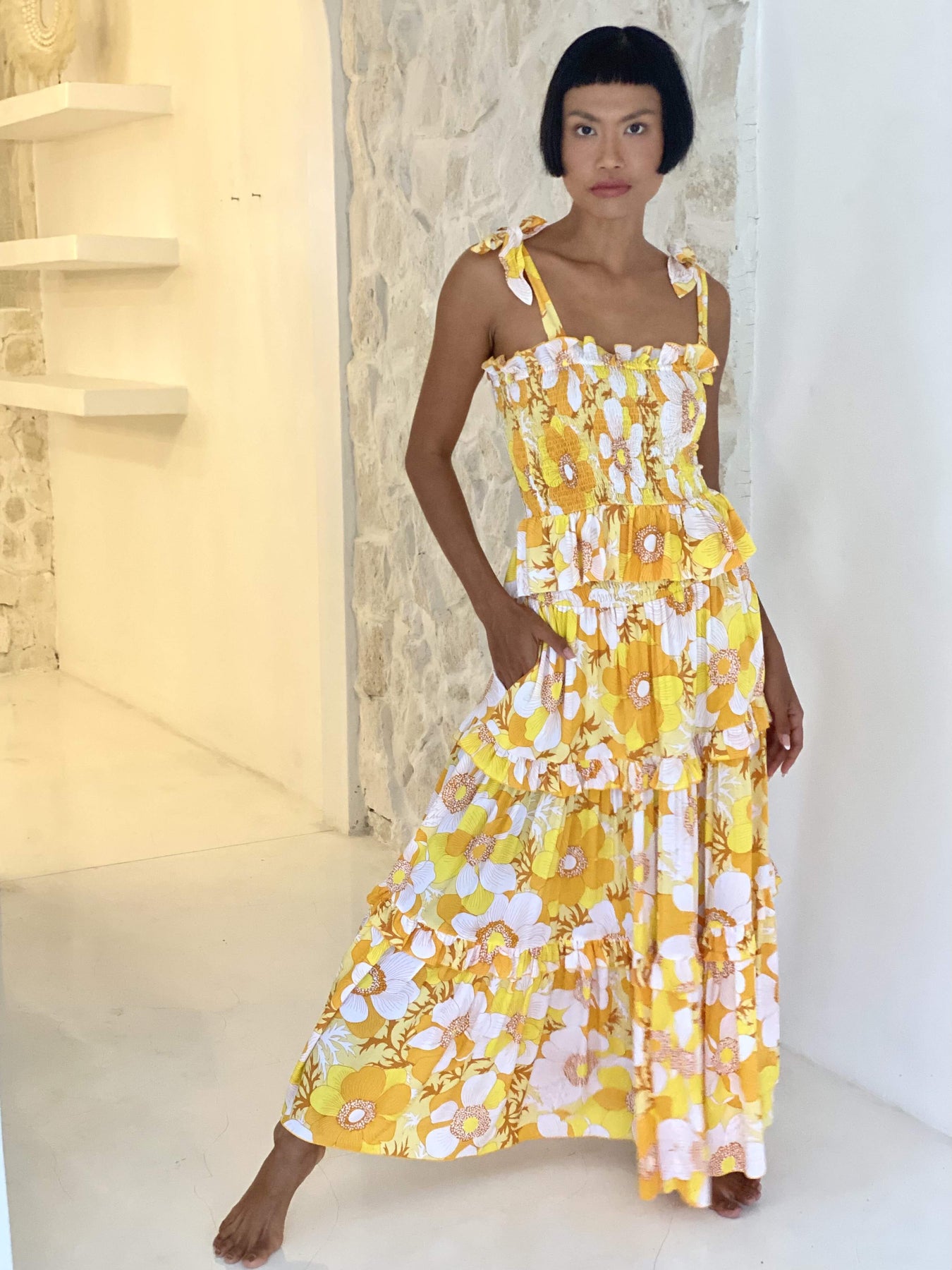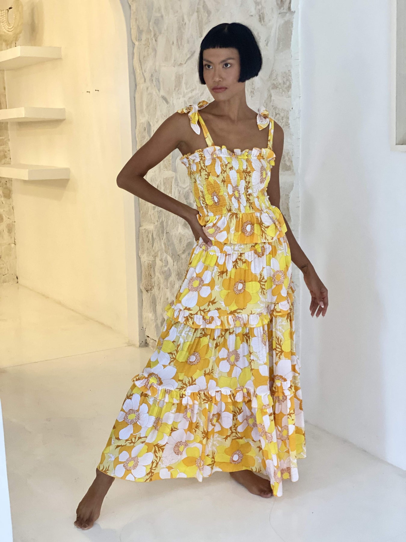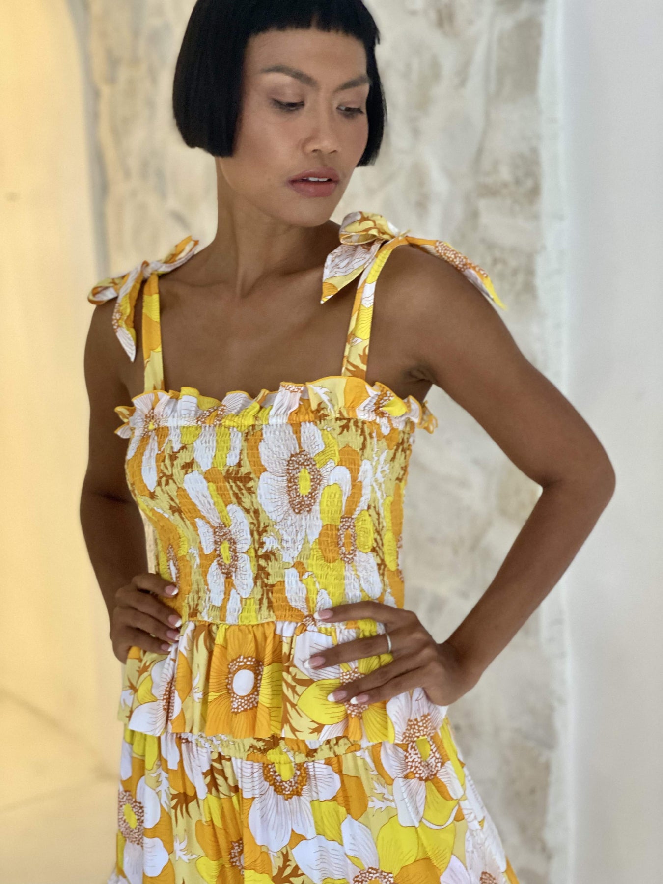 Shiva Top is a new edition to our fantastic 2023 Collection Queen of the Light. Shiva is a sleeveless bow tied at the shoulder top with flattering and flexible roushed bodice. Shine the light print is an extremely pretty signature print that is matched perfectly with this style. Pair it with TARIFFA skirt. Model wears a size S.