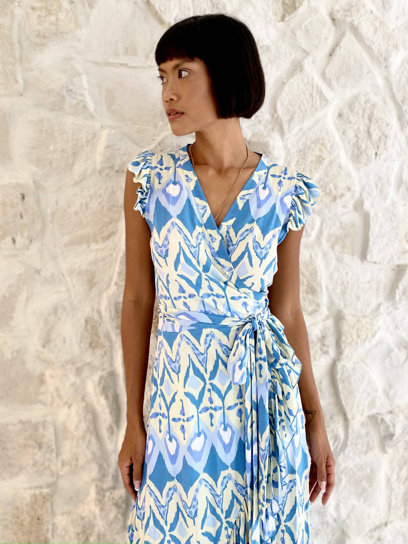 TOP SELLING STYLE. Sunset Wrap Dress is the most fantastic fitting wrap dress. This year with small design modifications and coming in such beautiful prints... With flattering cross body wrap front, enhanced with a frill hem that elegantly trails to the floor. Model wears size S. PRINT - BLUE AURA
